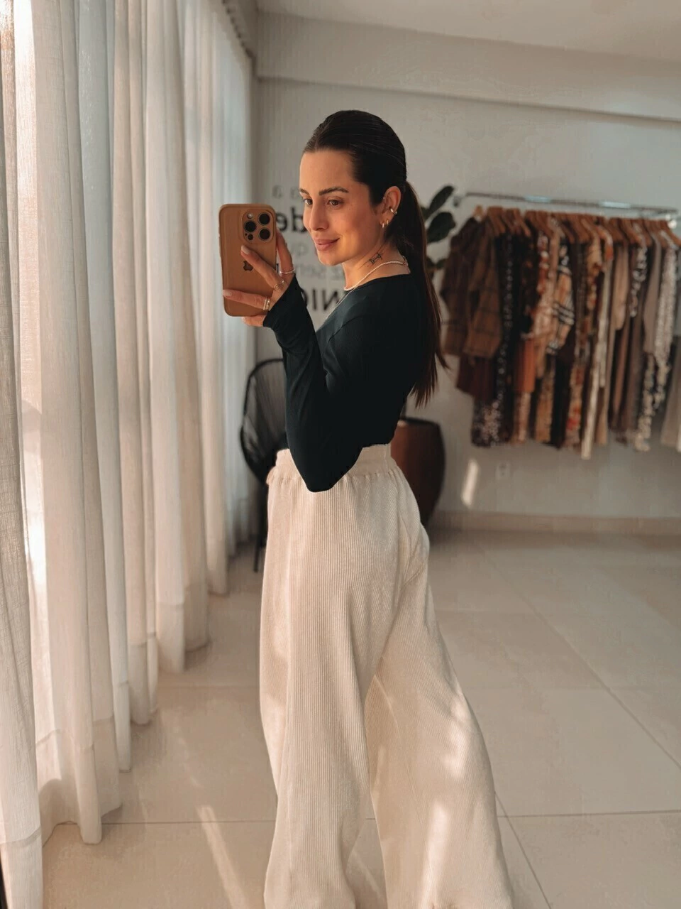 detalhe: calça pantalona com elástico na cintura com ajuste.